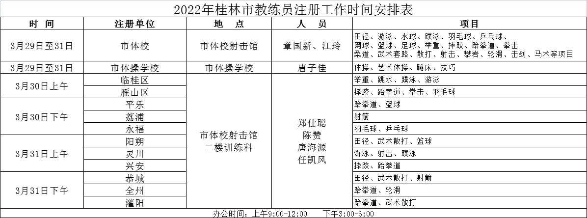 根据广西足协近日转发2022年度运动员教练员注册通知要求,各县(市、区)足球教练员需在桂林市体育局注册,请相关人员及时在今、明两天注册(详见通知)。同时,还需要在桂林市足球协会进行注册,足协注册联系人:赵家峰,电话:15295998862。